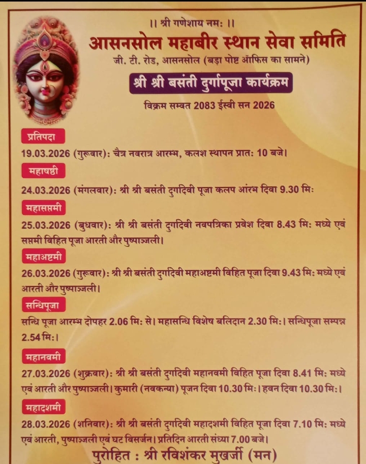 आसनसोल । आसनसोल जीटी रोड स्थित बड़ा पोस्ट ऑफिस के पास स्थित महाबीर स्थान मंदिर में आसनसोल महाबीर स्थान सेवा...