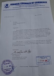 क्या हमारा नगर निगम इतना लाचार हो गया है कि शहर की नालों की सफाई कराने के लिए कुछ फुटपाथ के दुकानदारों को कुछ समय के लिए हटा नहीं सकता है । हमलोग कहते-कहते थक गयें हैं लेकिन आज तक नगर निगम सजग नहीं हुई है । आज एक बार पुनः अनुरोध कर रहा हूं सजग होइए नहीं तो आसनसोल बाजार का भविष्य अंधकारमय होने से कोई नहीं रोक सकता है । दुकानदार पलायन कर रहें हैं और ये बाजार नहीं अतिक्रमण का शहर बनने जा रहा है । जिसका जिम्मेदार आसनसोल नगर निगम बनेगा और कोई नहीं। इस पत्र की कॉपी पश्चिम बर्दवान जिला अधिकारी को भी दी गई है।