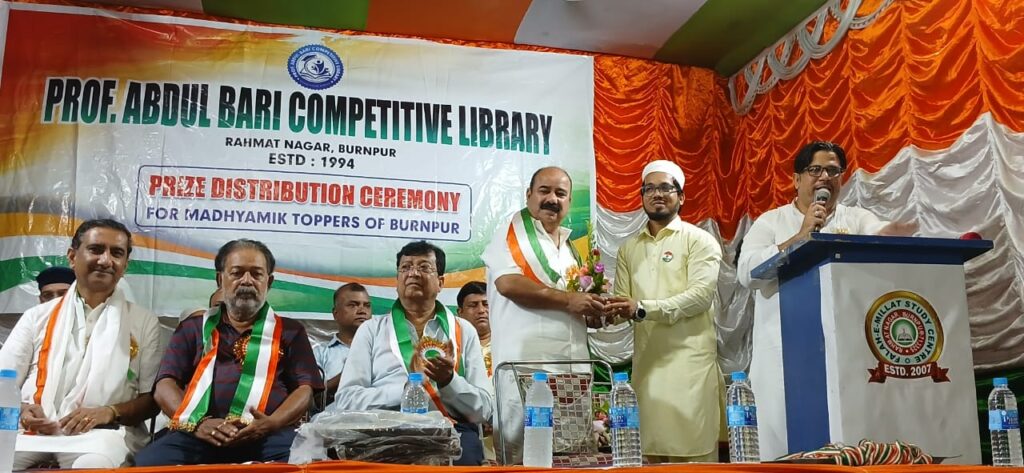 बर्नपुर(भरत पासवान)। प्रोफेसर अब्दुल बारी कम्पीटीटिव लाइब्रेरी की ओर से लाइब्रेरी कमेटी के अध्यक्ष सह समाजसेवी सैयद इकबाल हुसैन के नेतृत्व में शुक्रवार की देर शाम रहमतनगर में पुरस्कार वितरण समारोह का आयोजन किया गया। इस अवसर पर मुख्य अतिथि के रूप में डब्लूबीसीएस अधिकारी तौफीक समसा के अलावा अतिथियों में अतिथियों में बोरो 6 के चेयरमैन डॉ देवाशीष सरकार, बादल पुईतंडी, बर्नपुर बॉयज स्कूल के मोहम्मद कुद्दूस, आसनसोल गर्ल्स कॉलेज के डॉ बीरू रजक, रहमतनगर हाई स्कूल के इम्तियाज अहमद राशिद, कल्पतरु चटर्जी, खालिद खान सहित अन्य उपस्थित थे। साथ ही कार्यक्रम में विद्यार्थियों के अलावा काफी संख्या में स्थानीय लोग मौजूद थे। वहीं कार्यक्रम की शुरुआत में उपस्थित सभी अतिथियों को उत्तरीय पहनाकर एवं पुष्पगुच्छ देकर सम्मानित किया गया। कार्यक्रम के दौरान अतिथियों के हाथों आसनसोल, बर्नपुर के विभिन्न स्कूलों से इस वर्ष माध्यमिक परीक्षा में अव्वल अंक प्राप्त करने वाले 60 विद्यार्थियों को सिल्वर मेडल एवं प्रशस्ति पत्र देकर सम्मानित किया गया। साथ ही इस लाइब्रेरी से तैयारी कर सरकारी नौकरी प्राप्त करने वाले युवाओं को भी सम्मानित कर प्रोत्साहित किया गया।