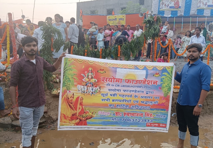 आसनसोल । सयोमा फाउन्डेशन के तत्वावधान में रेलपार आसनसोल में सूर्य षष्टी छठव्रत, महापर्व के अवसर पर दिनांक 27 एवं 28 तारीख को छठ घाट पर निःशुल्क शिविर लगाया गया। सभी छठव्रतियों एवं श्रद्धालुओं के लिए मंगल कामना कर प्रसाद वितरण भी किया गया। इस अवसर पर में भाग लेने वाले, शशिकान्त यादव, संस्था की ओर से सेवा कार्य में सोनुकुमार, काजल, दीपक देवनाथ, लोकनाथ कुन्डे, राजाराम पटेल, नवल किशोर सिंह, तथा अन्य उपस्थित थे। सज्जनों एवं महिलायें पारसनाथ यादब, प्रिन्स कुमार, प्रभात कुमार ज्योतिस्मा आदि ने भाग लिया।