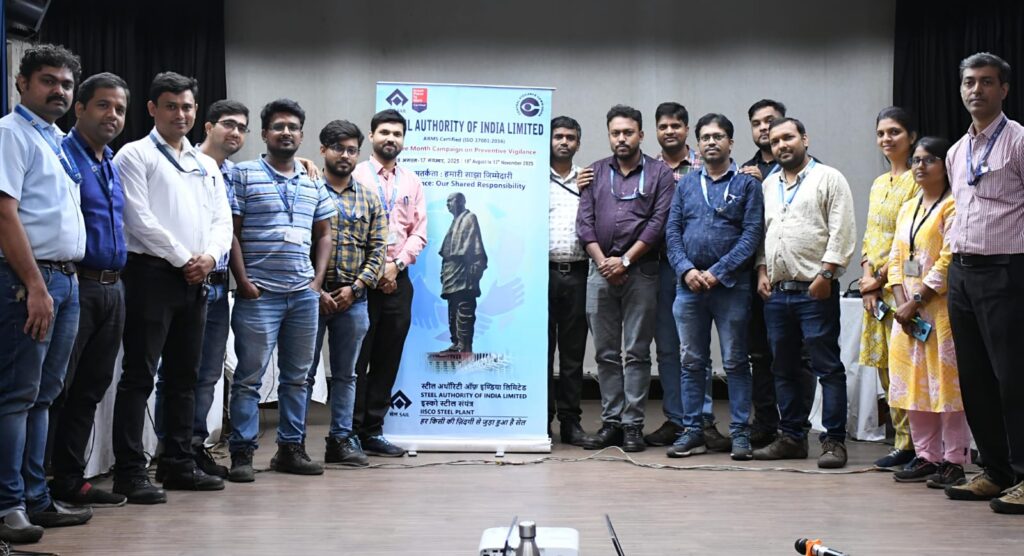 बर्नपुर । सेल-इस्को स्टील प्लांट, बर्नपुर में “सतर्कता: हमारी साझा ज़िम्मेदारी” थीम पर सतर्कता जागरूकता सप्ताह 2025 का तीन माह का अभियान 18 अगस्त से 17 नवम्बर 2025 तक आयोजित किया जा रहा है। इसी श्रृंखला के अंतर्गत आईएसपी सतर्कता विभाग द्वारा कर्मचारियों में सतर्कता संबंधी नैतिकता एवं प्रक्रियाओं के प्रति जागरूकता बढ़ाने हेतु दो क्विज प्रतियोगिताओं — ‘जागरण’ एवं ‘चेतना’ — का आयोजन किया गया। 29 अक्टूबर को आयोजित ‘जागरण’ क्विज प्रतियोगिता में अधिकारियों की 12 टीमों ने उत्साहपूर्वक भाग लिया। इस क्विज का संचालन देबप्रिया दास, एजीएम (प्रोजेक्ट्स) द्वारा अत्यंत रोचक एवं ज्ञानवर्धक ढंग से किया गया।