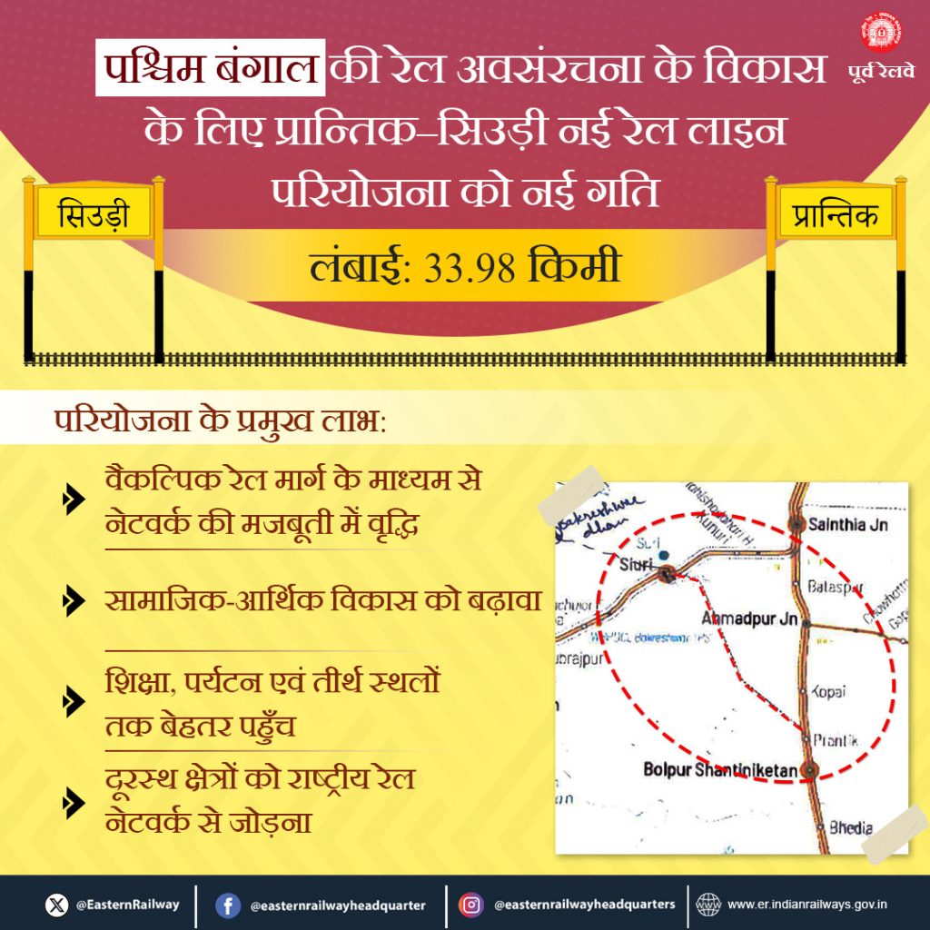 प्रान्तिक – सिउड़ी नई रेल लाइन (33.98 कि.मी.) परियोजना के इस पुनरुद्धार से पश्चिम बंगाल की जनता को न केवल क्षेत्रीय संपर्क में वृद्धि का लाभ मिलेगा, बल्कि दूरस्थ क्षेत्रों को भी इस संपर्क के माध्यम से देश के व्यापक रेलवे नेटवर्क से जोड़ा जा सकेगा।