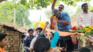 प्रचार के दौरान एक भावुक नजारा देखने को मिला जब एक स्थानीय महिला ने आगे बढ़कर जीतेंद्र तिवारी को गेंदे की माला पहनाई। तिवारी ने झुककर माला स्वीकार की और महिला का आभार जताया। आसपास मौजूद भीड़ ने इस पल को अपने मोबाइल में कैद किया।
