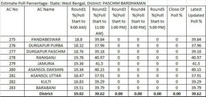 शुरुआत में सुस्त रहे दुर्गापुर पूर्व में भी अब वोटिंग तेज हो गई है और 11 बजे तक 37.88% मतदान हुआ। आसनसोल उत्तर 38.12%, आसनसोल दक्षिण 39.45%, कुल्टी 39.21%, पांडवेश्वर 38.76% और दुर्गापुर पश्चिम 38.93% पर वोटिंग पहुंच गई है।